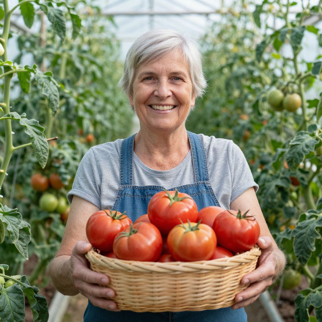 Senior woman smiling brightly while holding a basket brimming with vibrant red tomatoes, surrounded by lush green tomato plants in a greenhouse setting.