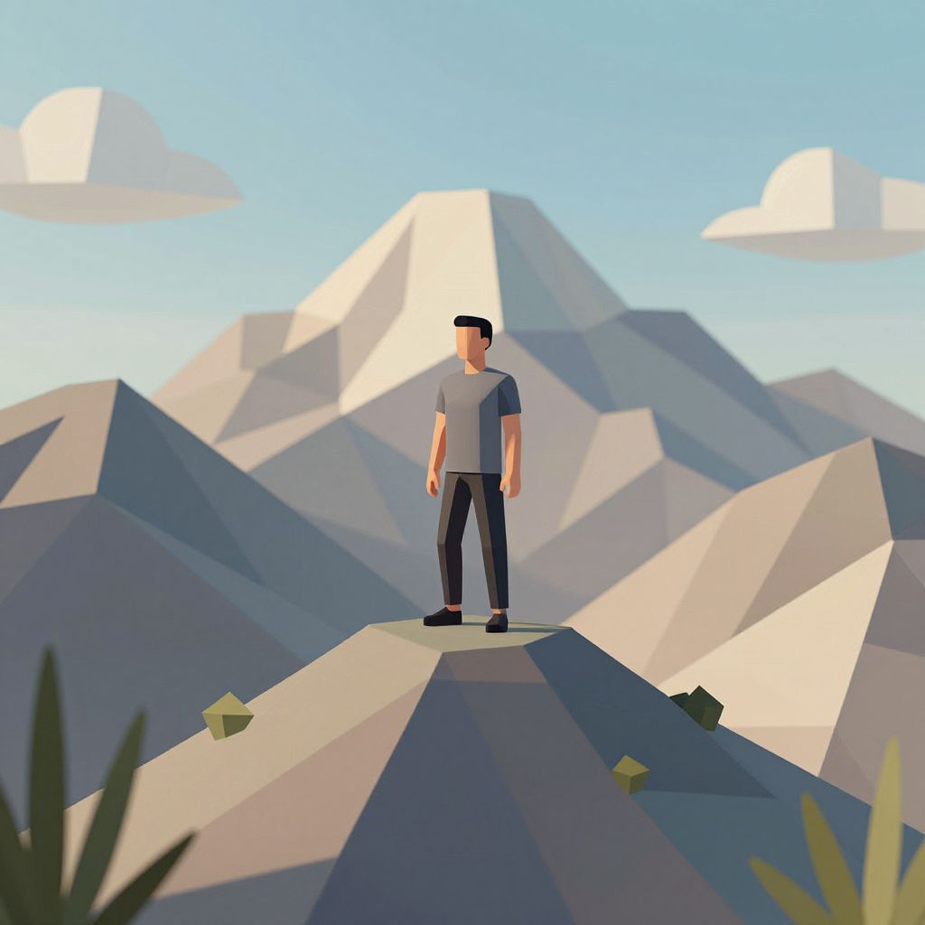 Geometric-style digital illustration of a man in a gray shirt and black pants standing on a mountain peak with large, angular mountains and fluffy clouds in the