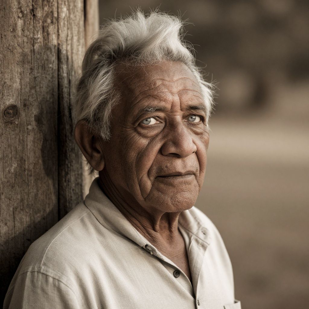 Capture an iPhone portrait of a distinguished elderly Aboriginal man with misty blue eyes and a silver pompadour. Set against a soft, sepia-tononed background, he leans casually against a rustic wooden wall, bathed in warm sunlight that casts shadows across his weathered face. The lighting accentuates the fine lines that tell stories of a life filled with experiences. This portrait aims to evoke deep nostalgia, inviting contemplation and admiration for the wisdom that comes with age, while celebrating the timeless elegance and unique character etched in his features.