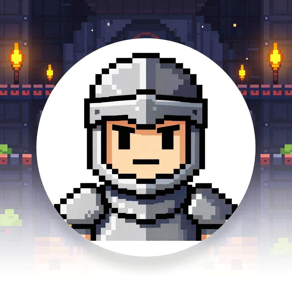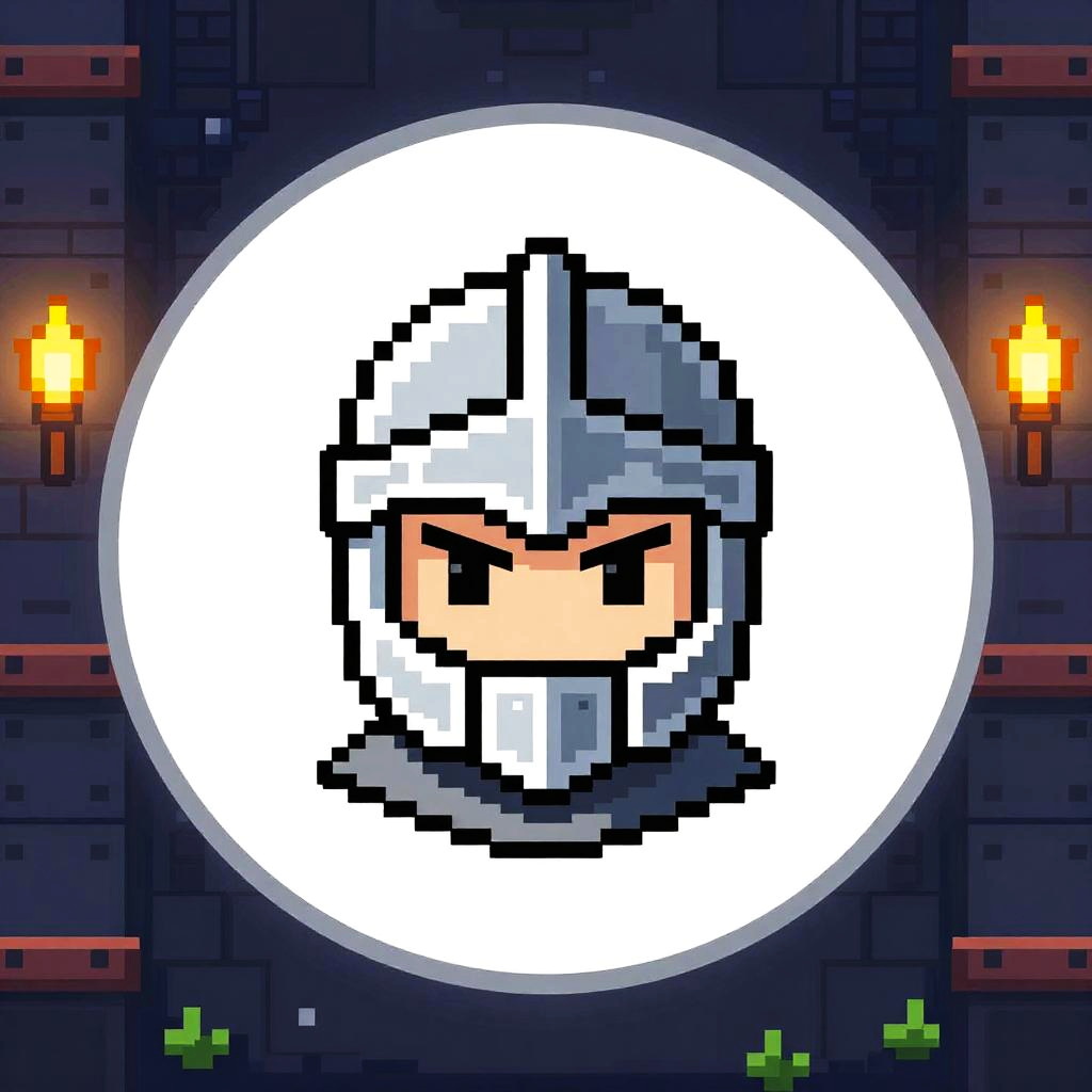 Pixel art avatar profile avatar of a brave pixel knight wearing a shining helmet set against a retro 8-bit dungeon corridor with torches, bold outlines, crisp vector shapes, glossy highlights, determined expression, soft rim light, centered bust, circular crop, minimal background clutter, clean negative space, high contrast, smooth shading, subtle glow, sticker vibe, 1:1 aspect ratio, SDXL, social media icon, ultra sharp
