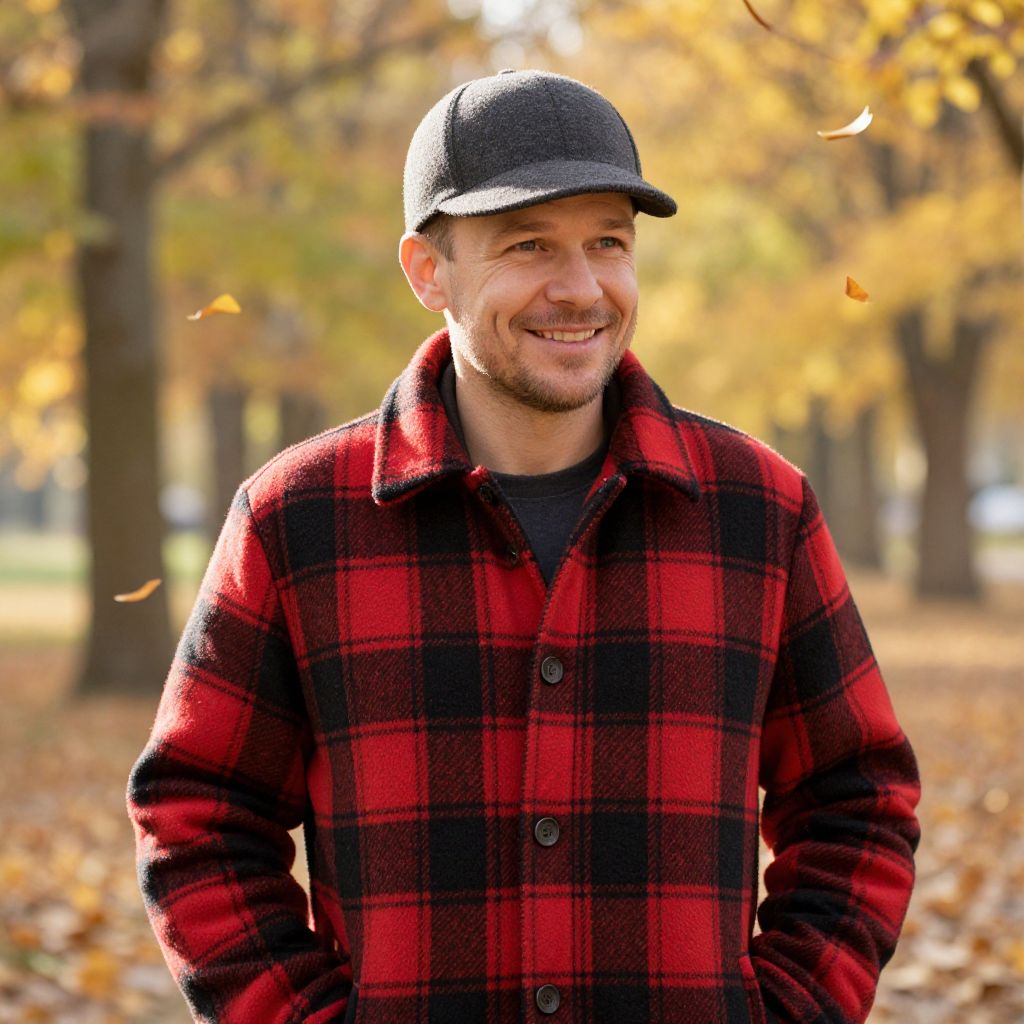 A man in his late 30s with a warm, friendly smile, wearing a vibrant red and black plaid jacket, the pattern clearly visible on his shoulders and chest, paired with a classic wool hat that sits neatly on his head, slightly tilted to one side. He stands in a sunny autumn park, with golden leaves swirling around him, giving off a cozy, timeless, and slightly nostalgic atmosphere. The lighting is soft and natural, with warm sunlight filtering through the trees, enhancing the rich colors of the jacket and hat. The overall mood is inviting and grounded, capturing a moment of quiet confidence and charm.