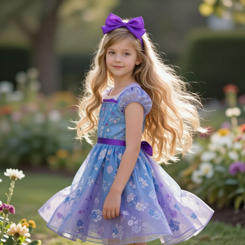 Photograph of a young blonde girl with long, wavy hair, wearing a light blue, short-sleeved, floral-patterned dress with a purple sash and a large purple bow in her hair. She stands in a sunlit garden, surrounded by blooming flowers and greenery. The girl's skin is fair, and she has a gentle smile. Her dress has a delicate, translucent overlay, adding a whimsical touch. The background is softly blurred, emphasizing her and the colorful garden. The sunlight highlights her hair, giving it a golden glow. The overall scene is bright and cheerful.