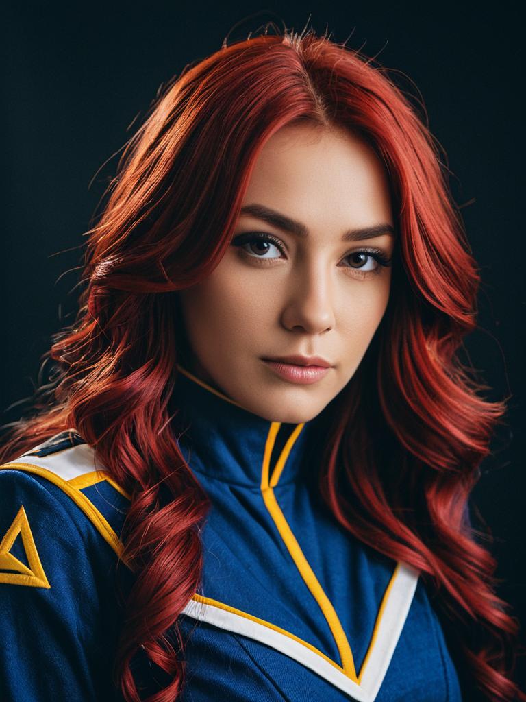 Woman in Mariah Mallad costume, professional cosplay studio headshot