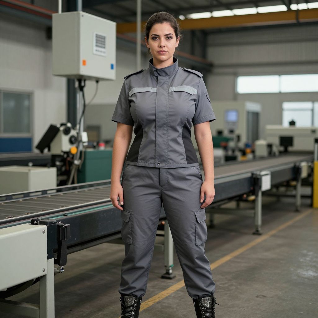A realistic photograph of a confident woman in her late 30s with sharp, defined features, hazel eyes, and a strong nose, wearing a structured, professional factory supervisor outfit — a tailored gray uniform with a high-collared vest, reinforced shoulders, and steel-toed boots — standing in a modern industrial factory setting with conveyor belts, machinery, and a large overhead control panel, conveying authority and competence.. The woman has big tits and cute face