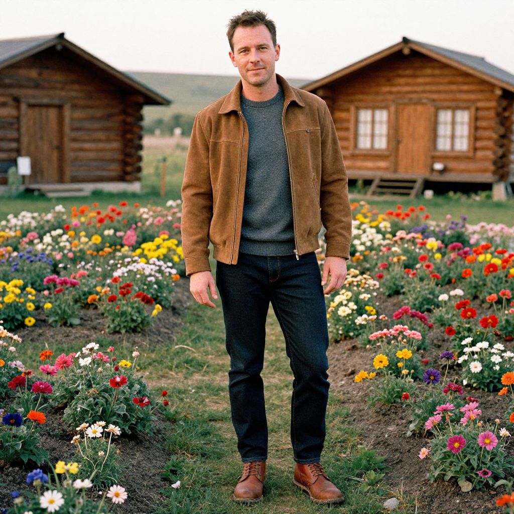 Photograph of a smiling middle-aged man standing in a park. He has short, neatly combed brown hair and is wearing a dark burgundy blazer with a black bow tie, white shirt, and black pants. He stands in front of a wooden bench with a weathered texture, flanked by two similar benches. Behind him is a vibrant flower bed filled with red, yellow, and white flowers. In the background, several people are walking along a path, blurred to emphasize the man in the foreground. The park setting is lush with greenery.