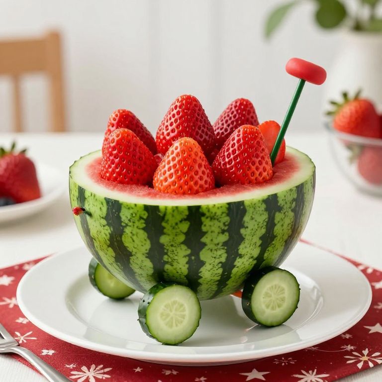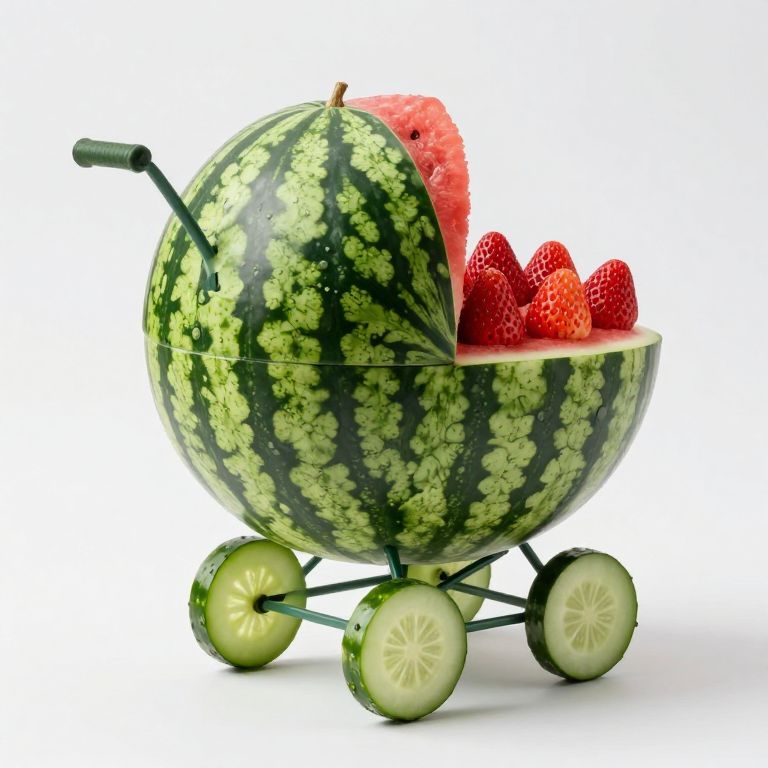 A whimsical watermelon transformed into a baby carriage, complete with cucumber wheels and a bed of strawberries, defies convention to create a surreal and enchanting centerpiece.