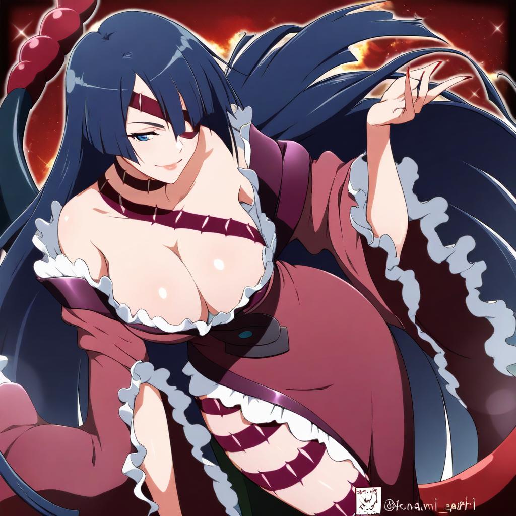 Adiane, tengen toppa gurren lagann, 1girl, scorpion tail, red eyes, eyepatch, blue hair, long hair, large breasts, cleavage, tattoo, dress, lipstick, by artist woofycakes, animagine