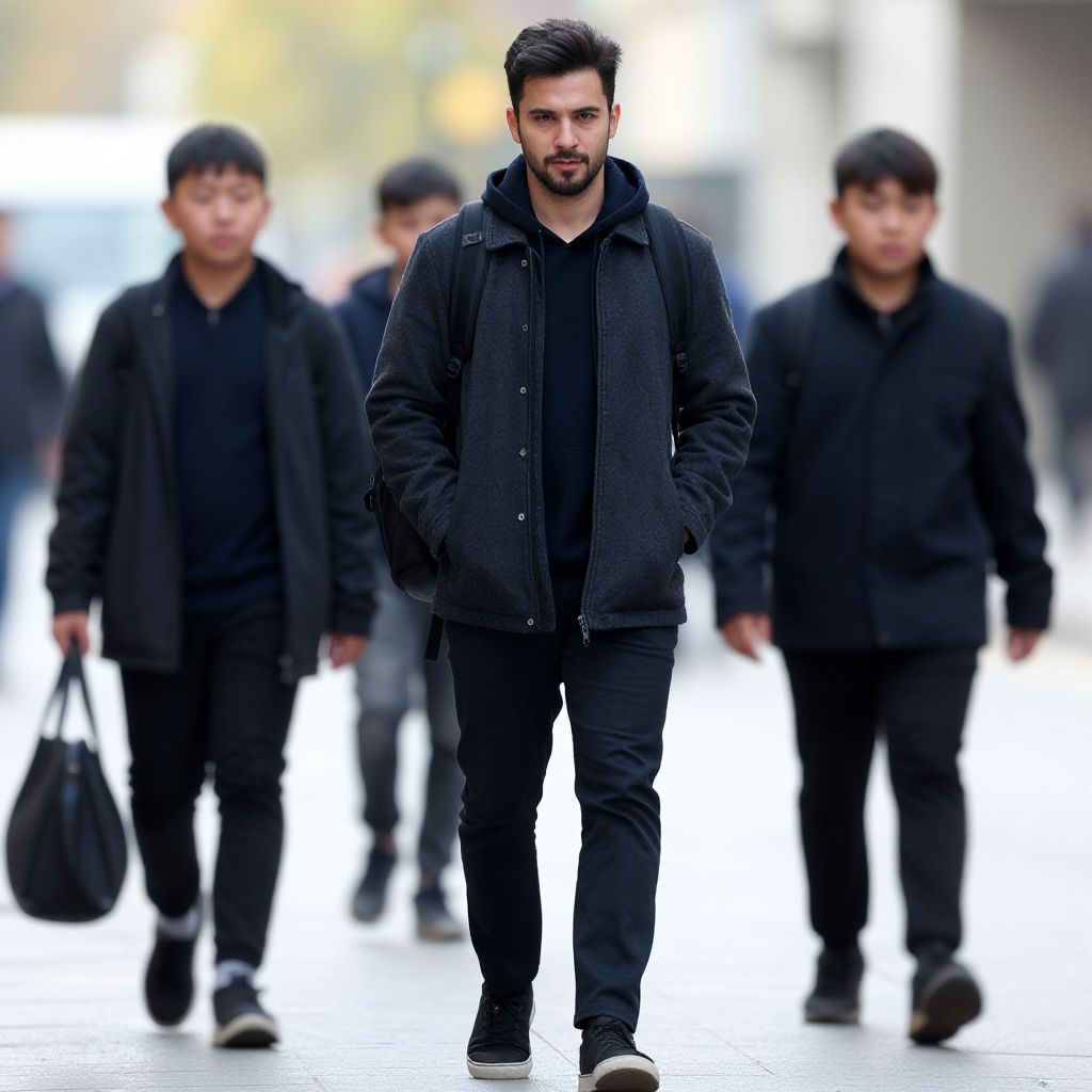 Photograph of a young, handsome Asian man with a dark beard and short black hair, walking confidently down a brightly lit urban sidewalk. He wears a black hooded jacket over a black shirt, black pants, and black sneakers. His hands are in his jacket pockets. Blurred in the background are three other Asian men, also dressed in black, walking in different directions. The man in the foreground is sharply focused, while the background figures are out of focus, creating a depth-of-field effect. The scene is brightly lit, with a white and yellow blurred background.