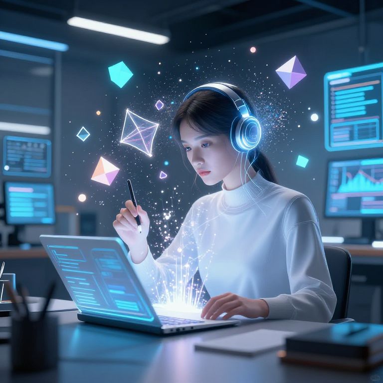 Dall e 3 ai digital masterpiece portraying an advanced AI artist at work, surrounded by floating geometric shapes and light particles, futuristic studio environment with sleek interfaces and holograms, emphasizing innovation and creative evolution in art