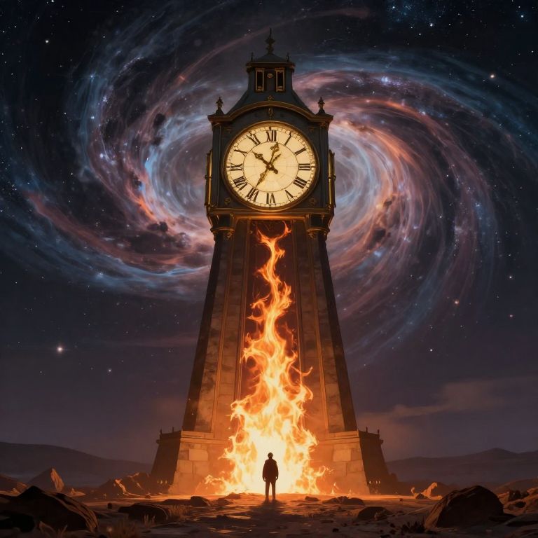 A towering clock looms against a swirling cosmic backdrop, its golden hands casting an otherworldly glow over a desolate landscape where a lone figure stands before a fiery portal that seems to bridge the heavens and earth.