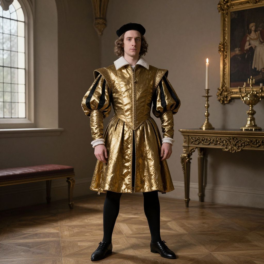 "Henry Viii, man in a golden and black outfit standing in a room"