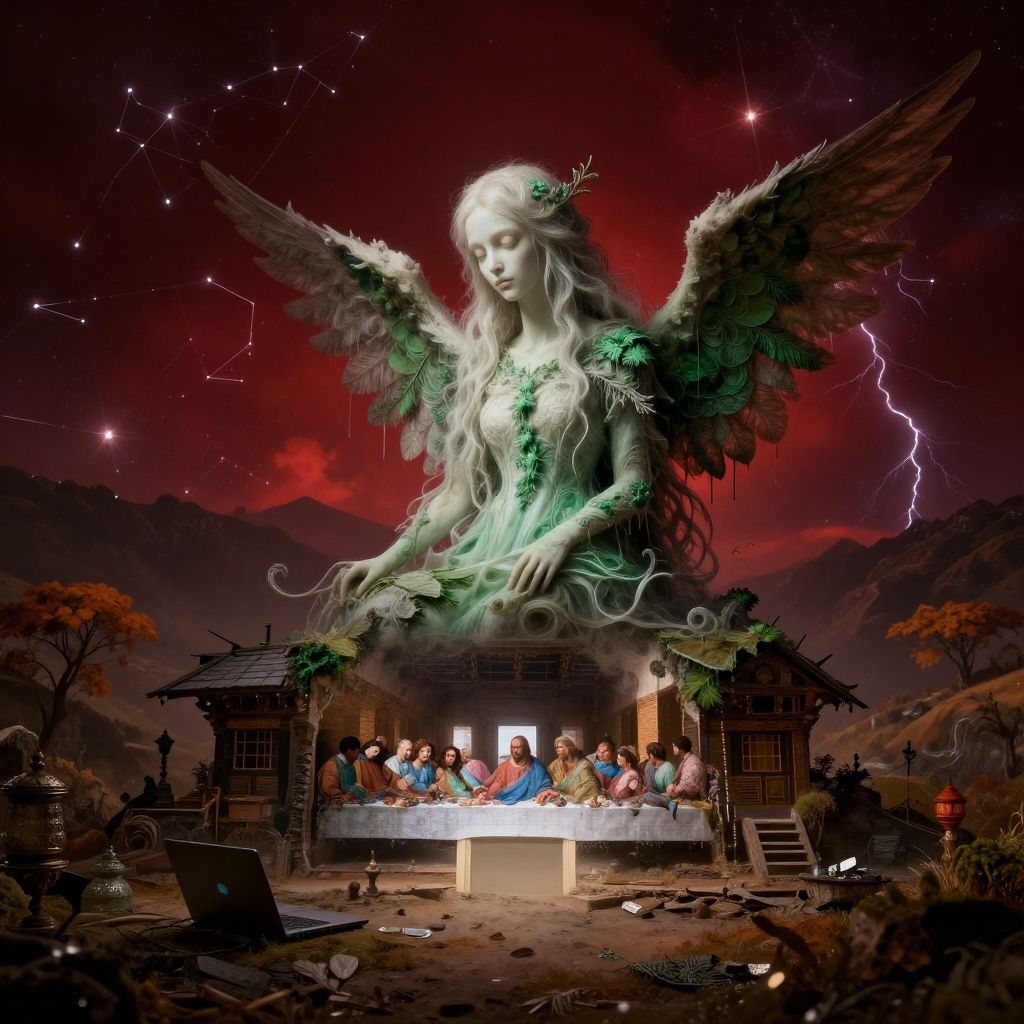 Tv_Adeline_MXAI, [ (surrealism art by Thomas Barbey:1.2) : (Takeshi Kitano:1.3) : (Laurel Burch:0.9) :11], grand Unreal Engine, highly detailed, long shot of a Nepalese ([Farmhouse:Laptop:5]:1.3), it is very Biomorphic and Angelic, it is in a Elder Scrolls setting, it is smooth, Constellation background, fall hillside and space, Thunderstorm, in focus, Realistic, Frightening, Thriftcore, dark red lighting, F/8, Warm Colors, dripping with dark green, White and Green details, in the style of the last supper, adobe lightroom, wallpaper
