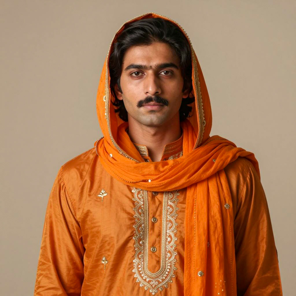 Pakistani designers costume, photorealistic portrait of Indian man, long black hair, mustache, wearing orange traditional Punjabi attire, embroidered with intricate patterns, orange scarf, hood up, looking directly at camera, neutral background, soft lighting, studio shot, cultural dress, serious expression, detailed ures, upper body focus, realistic colors