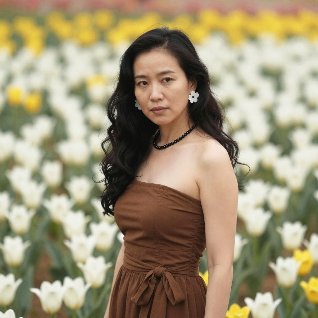 Photograph of an Asian woman with long, wavy black hair standing in a field of blooming white and yellow flowers. She's wearing a strapless, brown dress that ties at the waist, and white flower-shaped earrings. Her skin is fair, and she has a neutral expression. The background is softly blurred, focusing on the vibrant flowers. She's also wearing a black bead necklace.