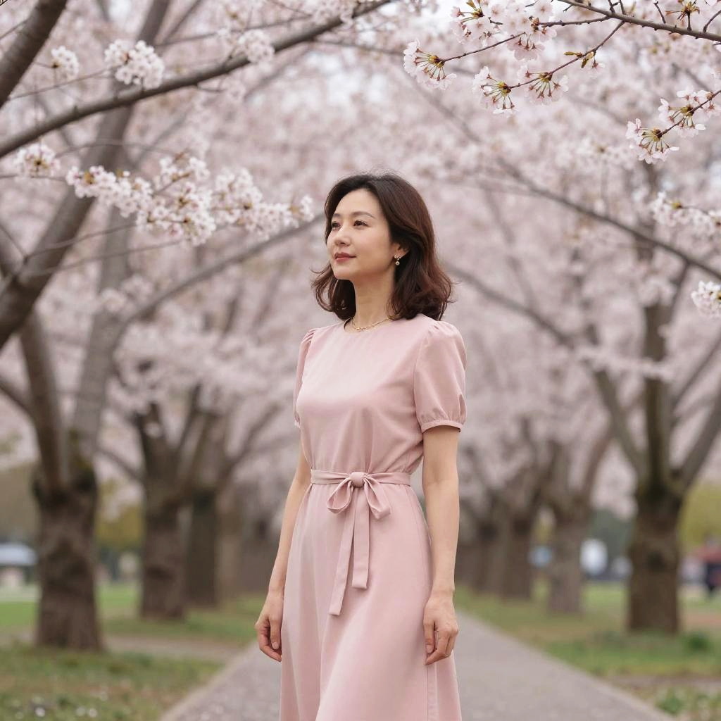 Photograph of an Asian woman standing in a field of blooming daffodils. She has long, wavy black hair and wears a strapless, brown dress with a tied waist, black choker necklace, and white flower-shaped earrings. Her expression is neutral, and she gazes slightly to the right. The background is blurred, showcasing a sea of yellow and white daffodils, creating a vibrant contrast with her brown dress. The lighting is natural, highlighting her smooth, medium-toned skin. The image has a soft focus effect, emphasizing the subject while gently blurring the floral backdrop.