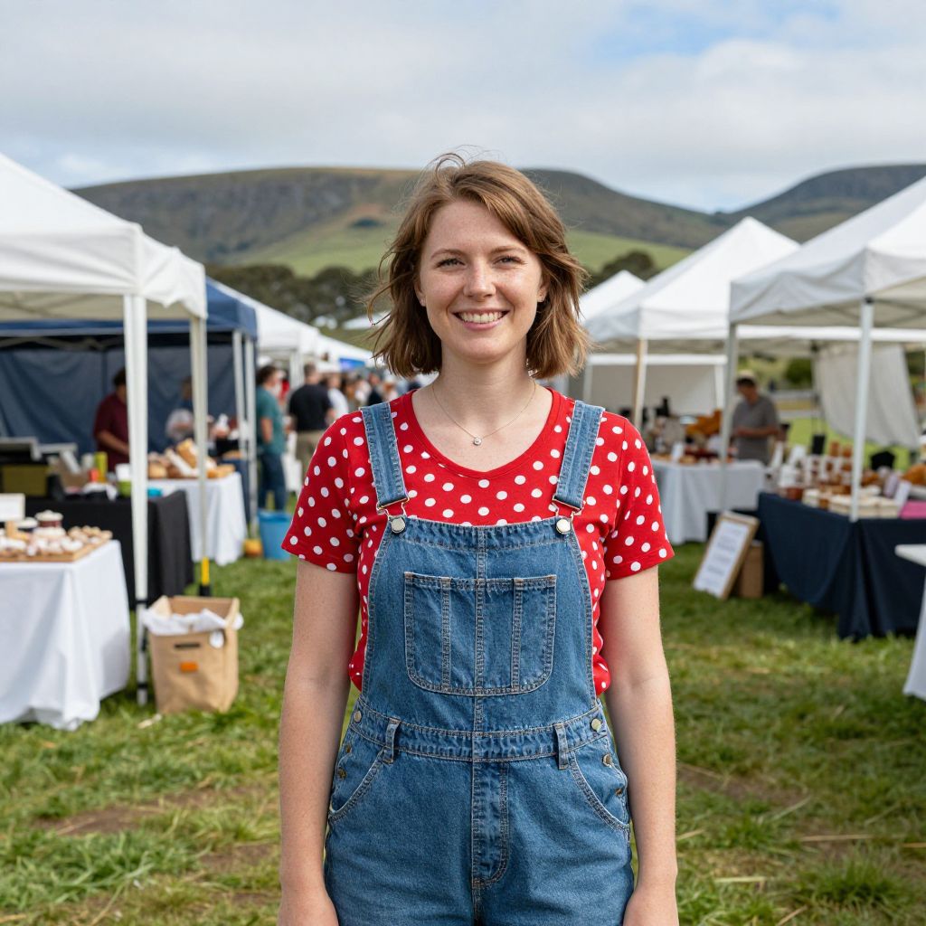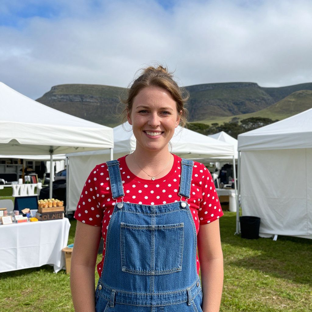 Woman smiling outdoors at the Hermanus Country Market, wearing a red polka-dot shirt and denim overalls, surrounded by white tents, green grass, and a backdrop of rolling hills under a partly cloudy sky.