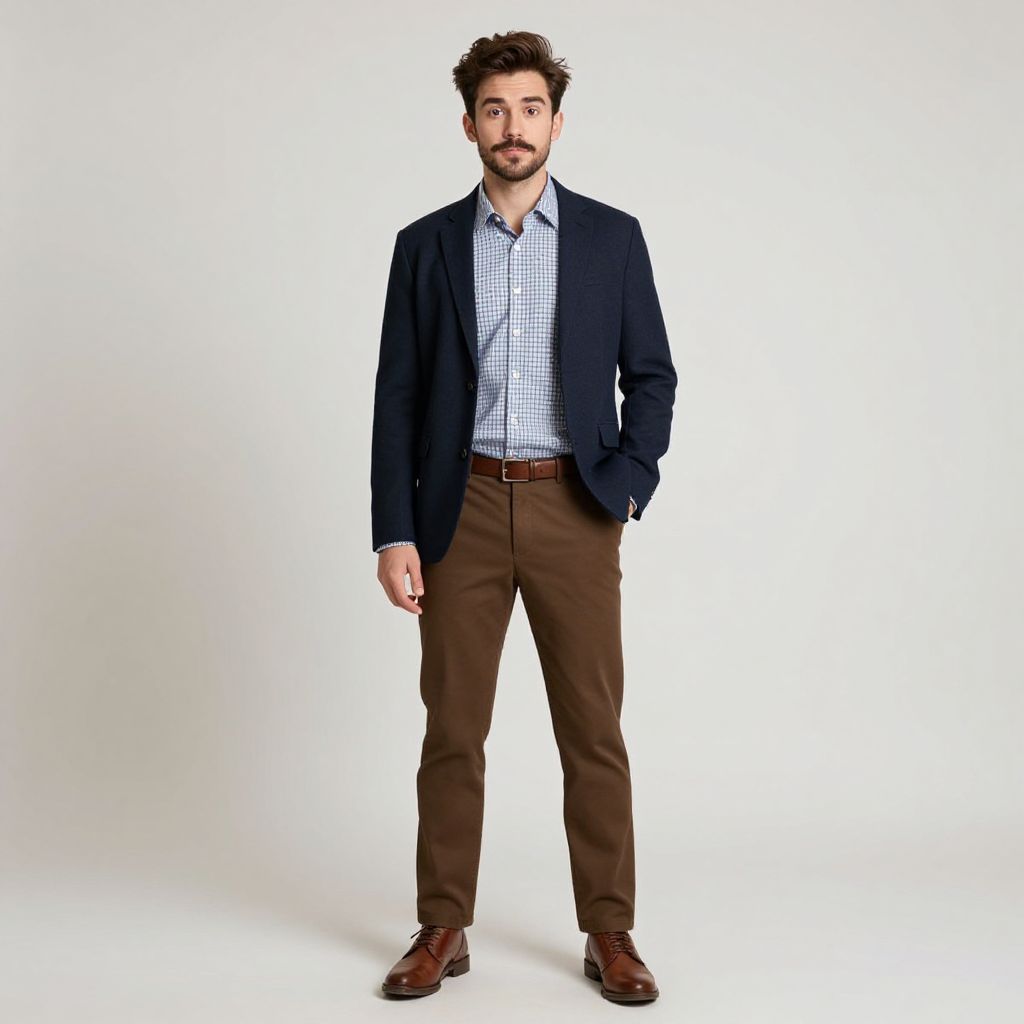 Man with short dark hair and a beard wearing a blue shirt and green pants with a brown belt.