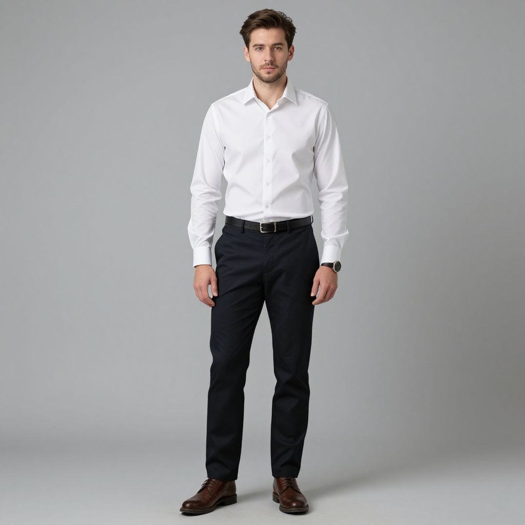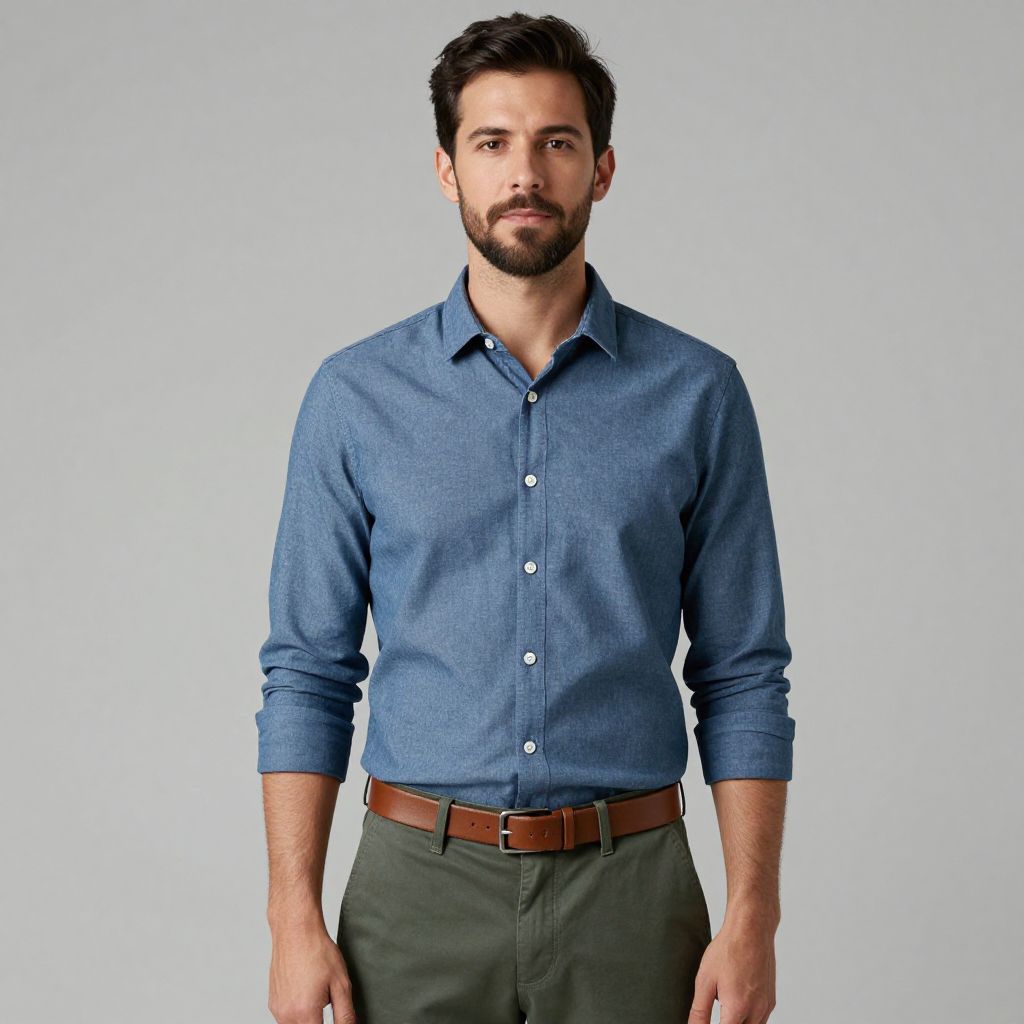 Portrait of a man with short dark hair and beard wearing a blue button-up shirt, green pants, and a brown leather belt. The man has a neutral expression and is standing against a plain gray background.
