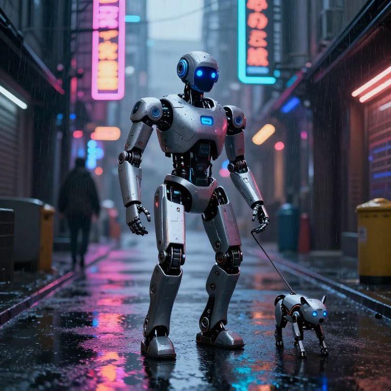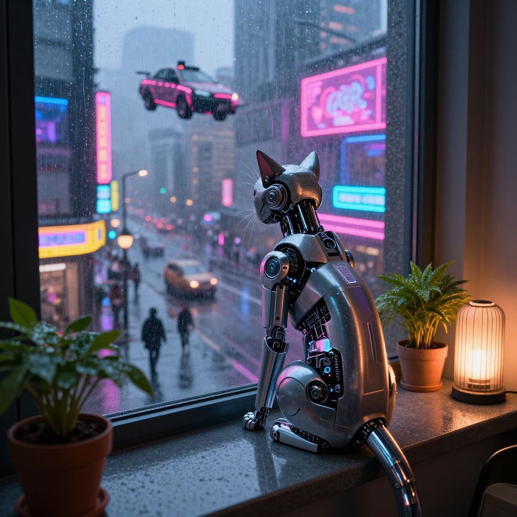 A sleek cyborg cat with a metallic body and intricate cybernetic details sits perched on a windowsill, gazing out into the rain-soaked cyberpunk city below, Raindrops streak down the large glass pane, distorting the vibrant neon signs and holographic advertisements that bathe the streets in shades of electric pink, blue, and yellow, Hover cars glide silently above the wet pavement, where scattered figures in raincoats hurry under flickering streetlights, The cat's metallic tail curls elegantly, its reflective surface catching the colors of the city, Inside the cozy room, potted plants rest on the sill beside the cat, their leaves dewy from the humid air, A soft, amber light glows from a vintage-style heater nearby, casting a warm contrast to the cold, rainy world outside, The reflection of the cat in the window blurs slightly, merging its cybernetic features with the dazzling cityscape beyond, In this tranquil moment, the sleek, futuristic feline seems both an observer and a symbol of the city’s synthesis of technology and life