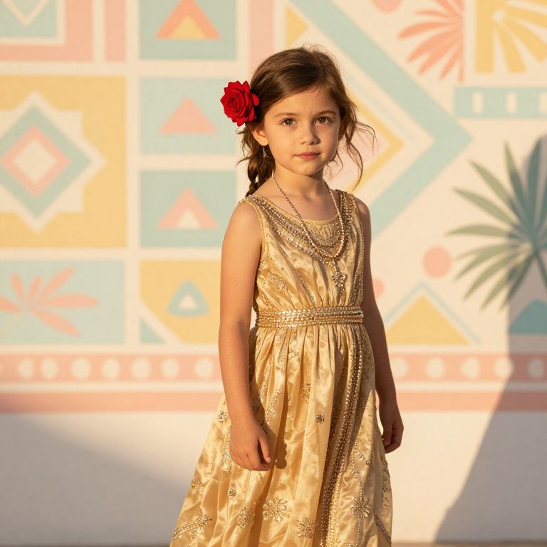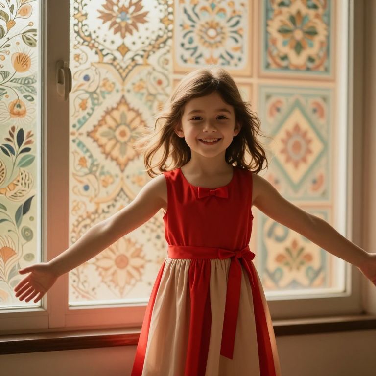 A young girl with soft brown hair, gently flowing in the breeze, is wearing a vibrant red and beige dress with a delicate red sash tied around her waist and a charming red bow at the neckline. She stands confidently in front of a large, patterned window, her arms outstretched with a warm, joyful smile, radiating innocence and happiness. The window frames a colorful, textured wall behind her, featuring intricate floral and geometric patterns in pastel and earthy tones. The lighting is soft and golden, casting a gentle glow on her face and the dress, creating a serene and inviting atmosphere.