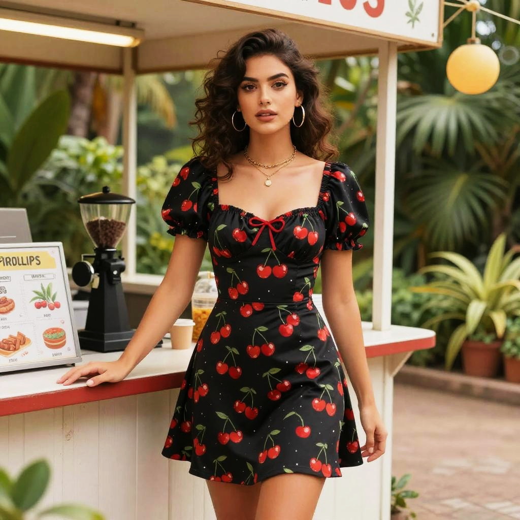 A lean woman in a white mini sundress with cherry print, spaghetti straps, and a flared skirt, stands in a vibrant art quarter street mural, embodying a whimsical wit studio visual style. Sexy. Pretty face and beutiful eyes