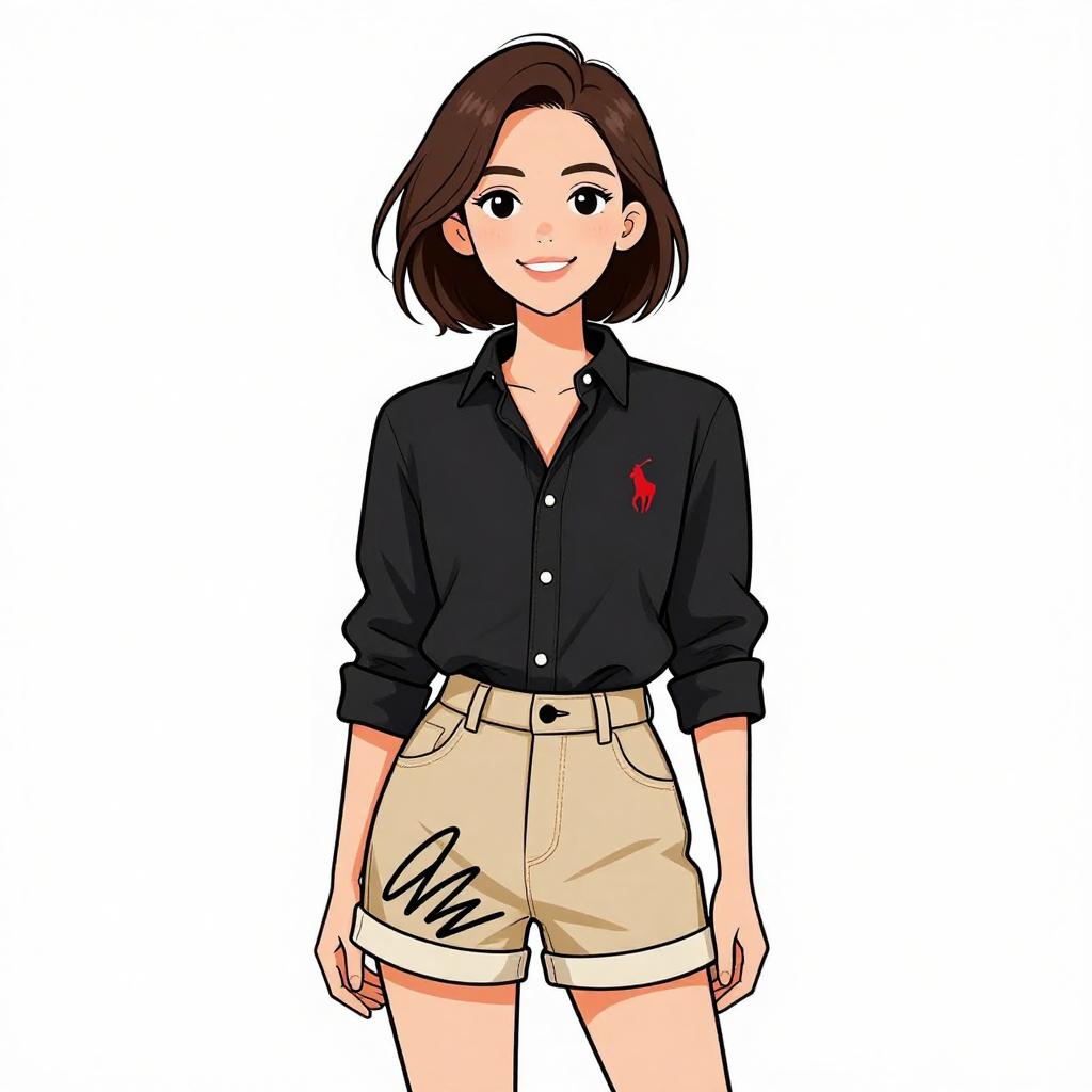 Woman with pretty face and pretty hair. smiling Woman, casual preppy, black button-up shirt with collar, long sleeves, Ralph Lauren logo on chest, tucked into high-waisted khaki shorts with cuffed hem, shorts feature a large signature scribble on one leg, plain white backdrop. --sref 1467