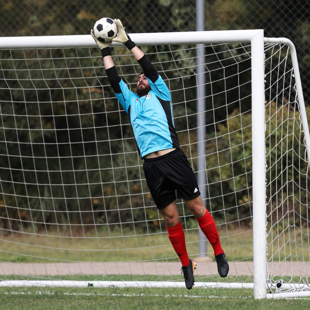 Dynamic Bearded Goalkeeper in Action
