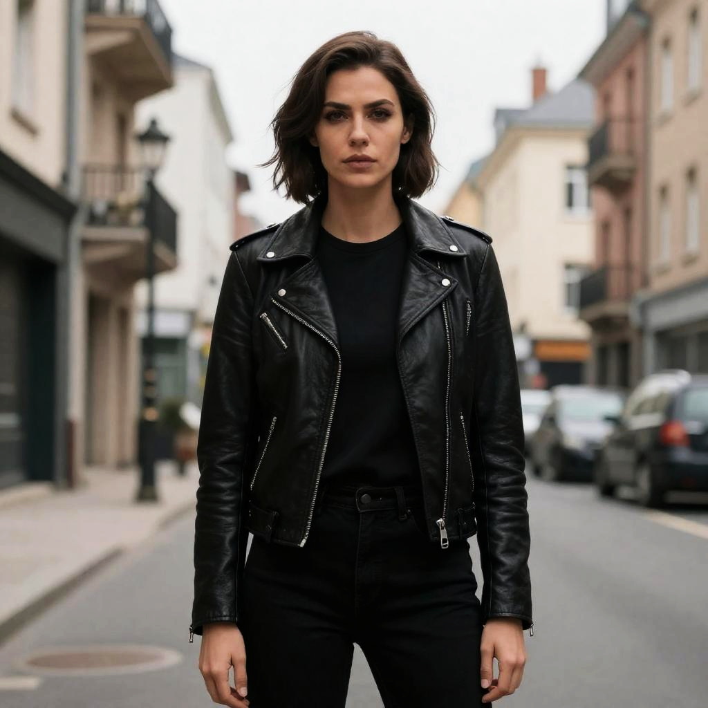Villain, woman in black leather jacket standing in the middle of a street