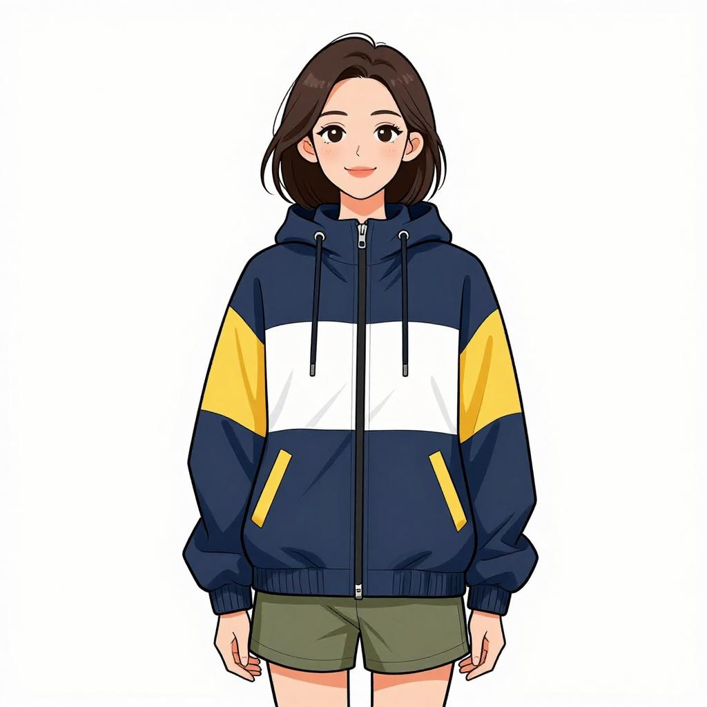 Woman with pretty face and pretty hair. smiling Woman, sporty casual, color-blocked windbreaker jacket in navy, white, and yellow, drawstring hood, front zip closure, side pockets with yellow flaps, cuffed sleeves with yellow bands, olive green shorts peeking underneath, and a white studio background. --sref 1467