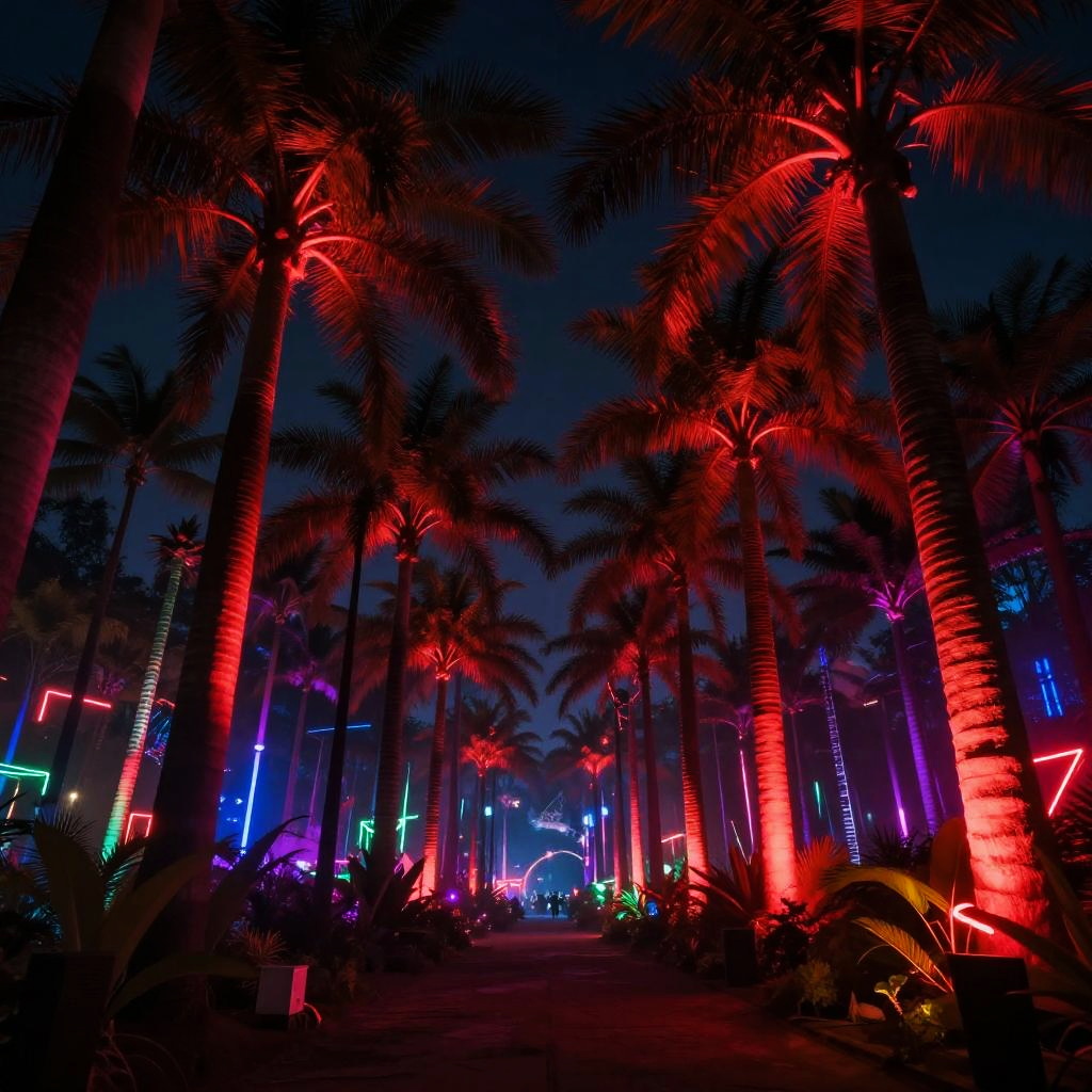 Photorealistic image of a glowing neon forest at night, with towering palm trees lit by bold crimson neon lights. Rave vibe, colorful uplighting, ultra-realistic octane render, high-definition, neon gel lighting creating a dreamy forest atmosphere