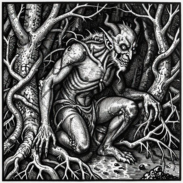 Intricate black-and-white woodcut of a muscular, horned creature crouching amidst tangled, twisted branches, evoking a primal, mythical