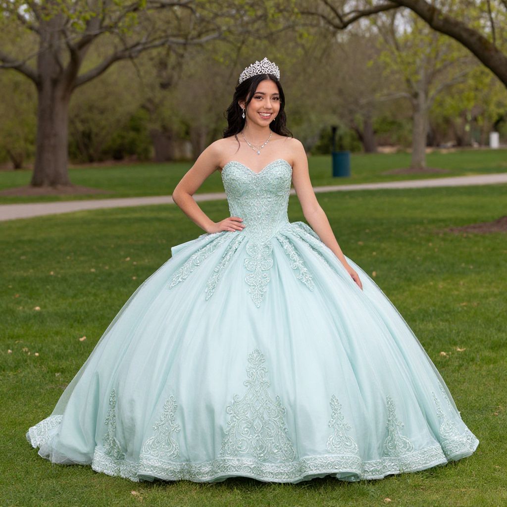 Radiant young woman wearing a strapless mint green quinceañera gown adorned with intricate beadwork and a sparkling tiara, gracefully posing outdoors on a lush green lawn surrounded by trees.