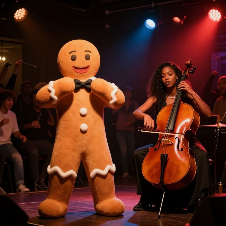 Photograph of a lively stage performance featuring a large, plush, cookie-shaped mascot with a smiling face, black bowtie, and white icing details standing center stage. To the right, an African-American woman with curly hair plays a wooden cello, wearing a black sleeveless dress. The background includes dimly lit audience members and colorful stage lights casting red and blue hues. The stage floor is dark, and the overall atmosphere is vibrant and energetic.