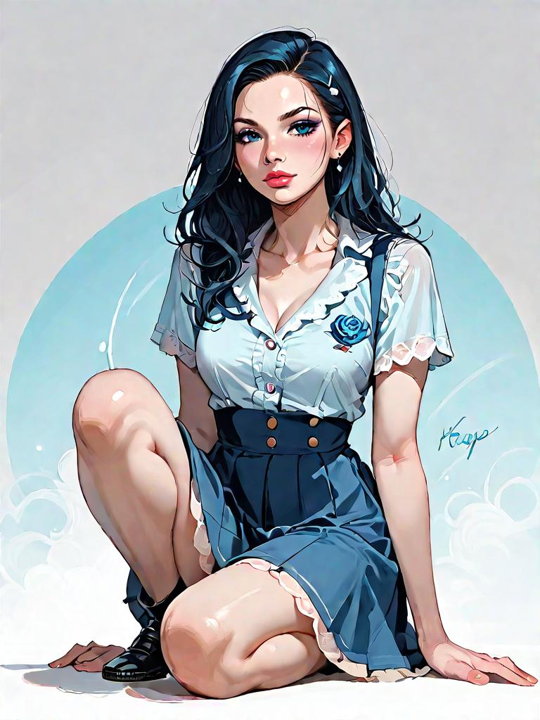 1girl, source_comics, realistic face, full body shot, Woman, casual chic, navy blue short-sleeve blouse with lace shoulder details, scoop neck, tucked into a tan suede mini skirt with front button-down closure, skirt with lace trim at the hemline.