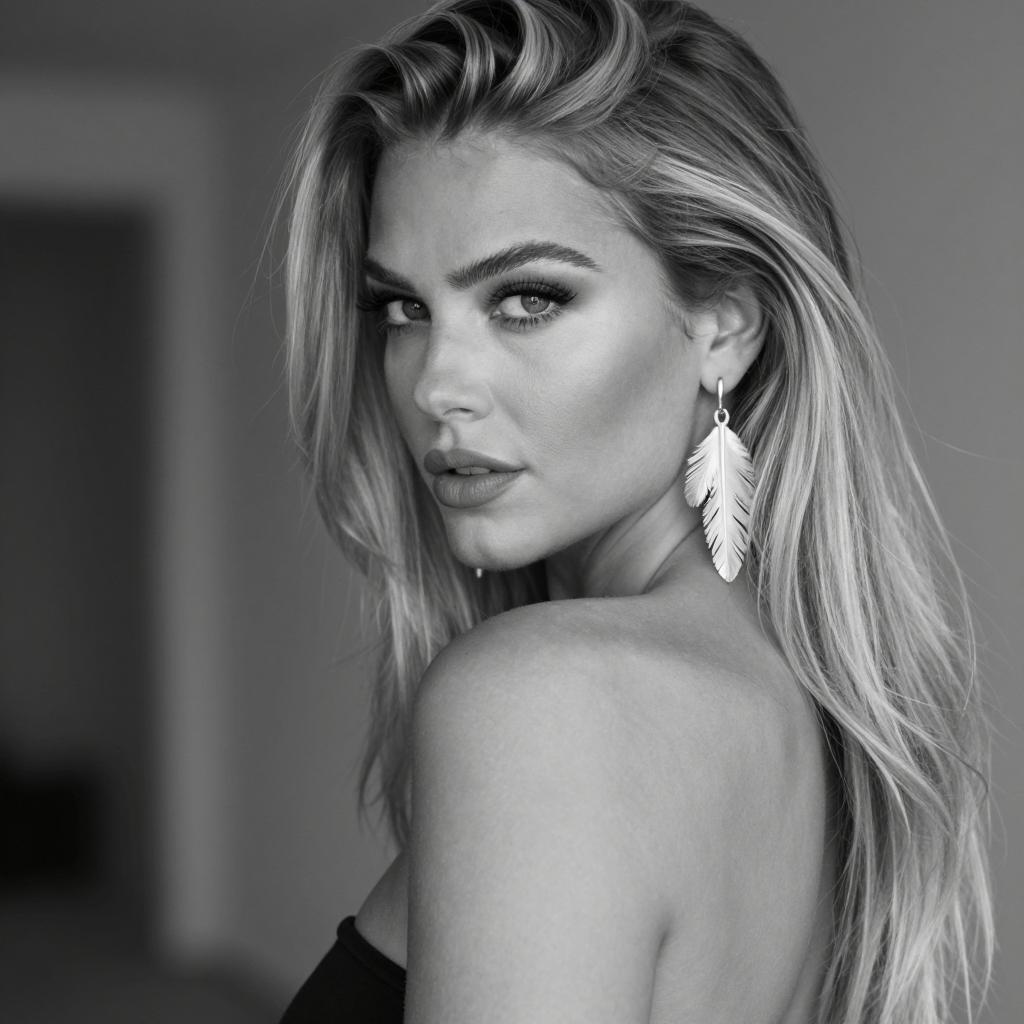 Blonde woman in strapless black dress and black boots, standing against white ured wall. Right arm raised, left hand holding black sequined jacket. Ground is gravel with black baseboard. She looks to the camera. Full body shot. Nighttime.