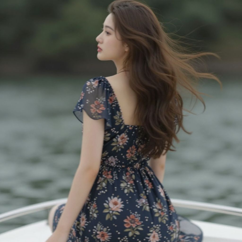 Boat party dress, 1girl, solo, dress, long hair, water, floral print, blurry, brown hair, outdoors