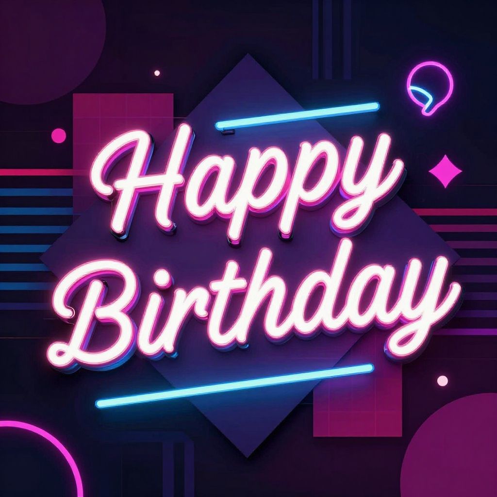 Artsy birthday images with retro-inspired neon signs saying 'Happy Birthday', bold geometric patterns, moody contrasting colors, playful typography, 80s synthwave aesthetic