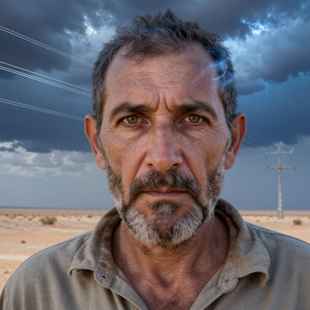 Create a vivid double exposure portrait with exceptional realism, depicting an aged man adorned in rugged facial hair and intense piercing eyes amidst a barren desert landscape. Overlaid upon this scene are intricate power lines stretching across electric-blue storm clouds, their silver strands weaving through the sky. As the subject's determined gaze meets that of the observer, his expression seems to defy yet embrace the powerful forces of nature surrounding him. The fusion of man and electrified atmosphere evokes a sense of tension and serenity, inviting contemplation on human resilience amidst an ever-changing world.