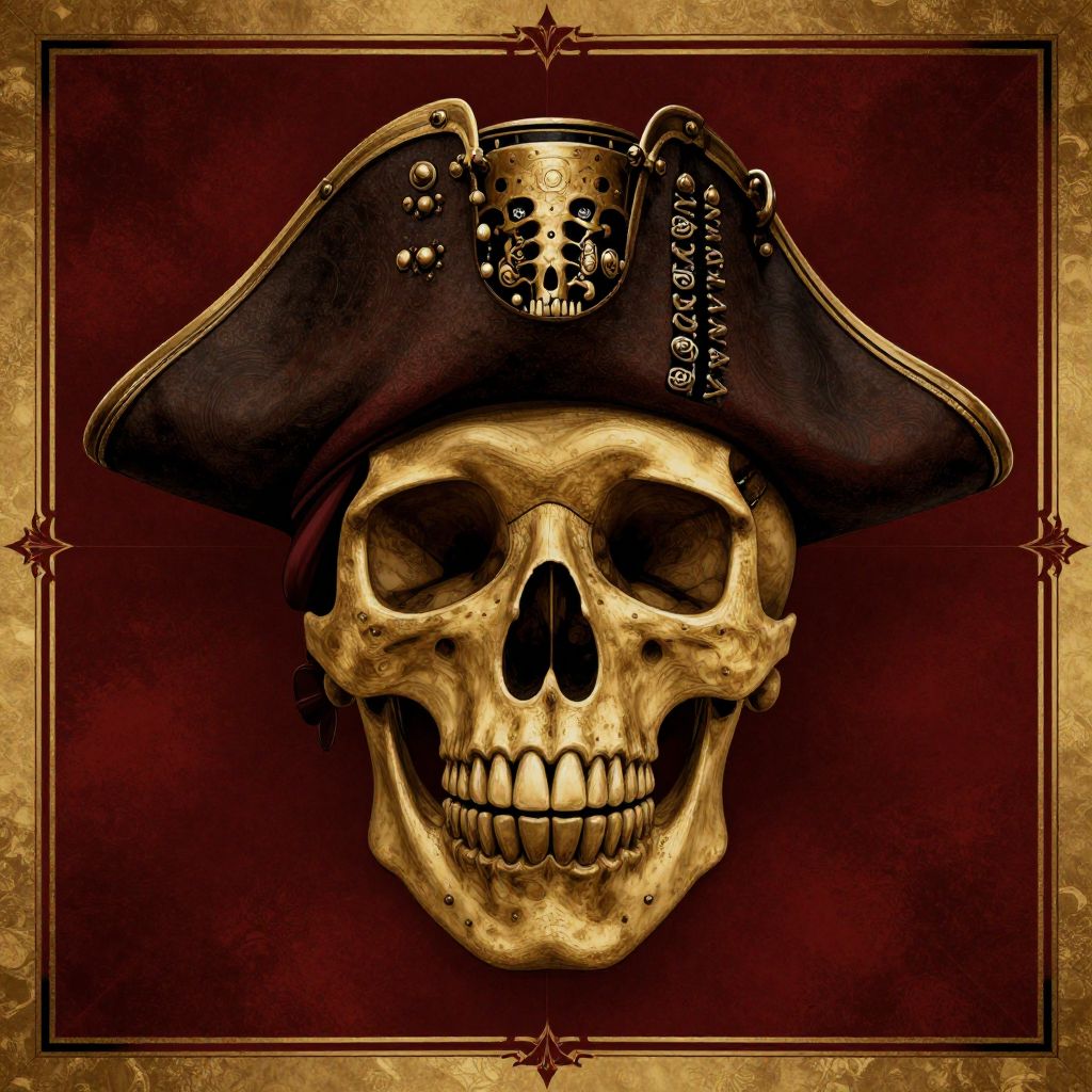 Digital illustration of a gold skull wearing a detailed black pirate hat with a skull emblem, against a maroon textured background with a gold border.