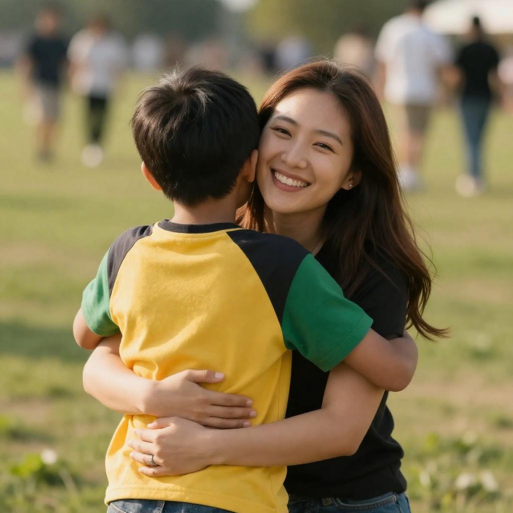 Photograph of a woman and young boy on a bus. Woman with long black hair, gray quilted jacket, leaning close to boy. Boy with short black hair, blue quilted jacket, looking up at woman. Bus seat with checkered pattern. Woman's right arm around boy's shoulder. Intimate, gentle interaction.