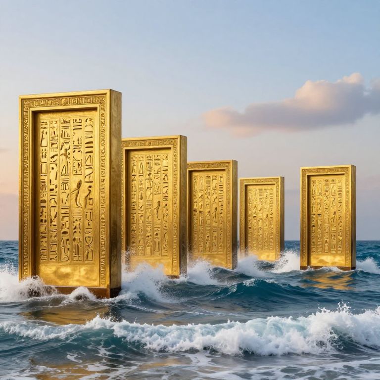 Six massive golden doors stand upright in the ocean, each intricately carved with hieroglyphics and progressively receding into the distance, as waves crash against their bases under a serene sky.