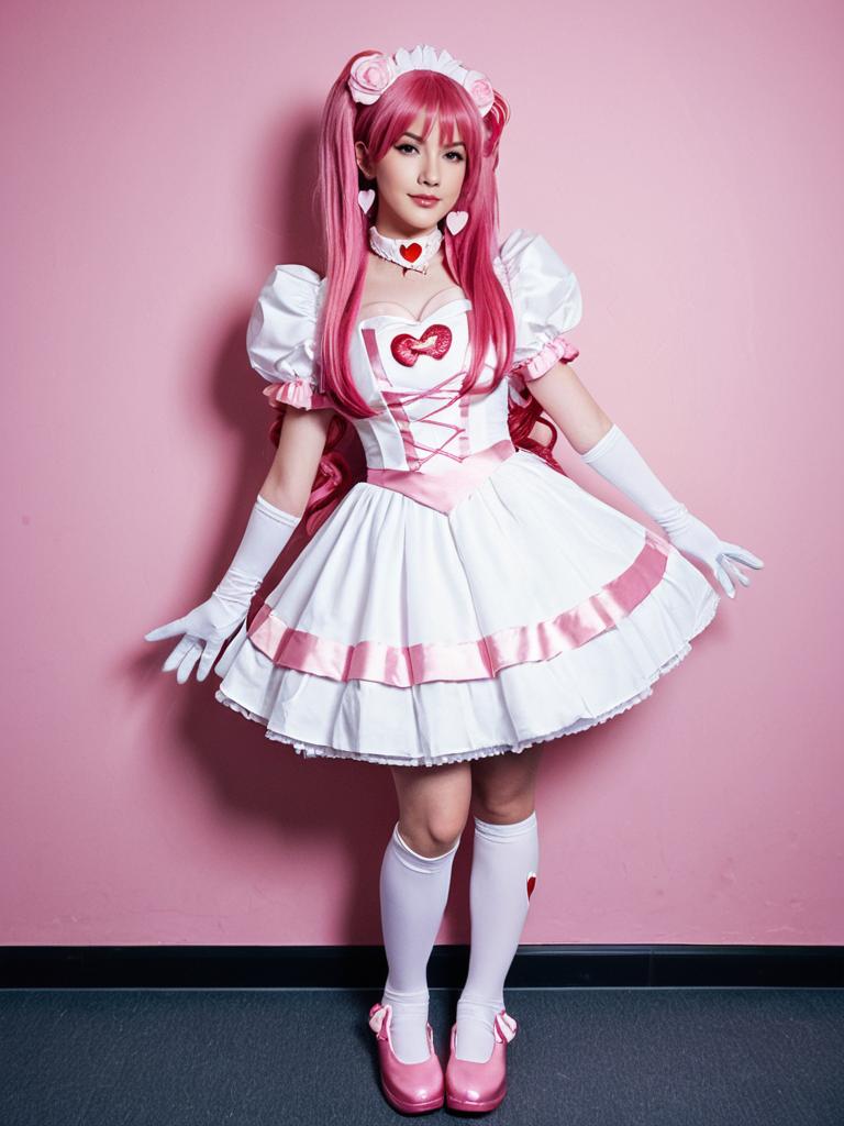 Photo-realistic cosplay photo of person in cure grace costume. Full body. Standing. Full length. 1girl, pink eyes, pink hair, long hair, very long hair, heart hair ornament, hair flower, white gloves, pink dress, pink choker, puffy short sleeves, earrings, magical girl, magical girl