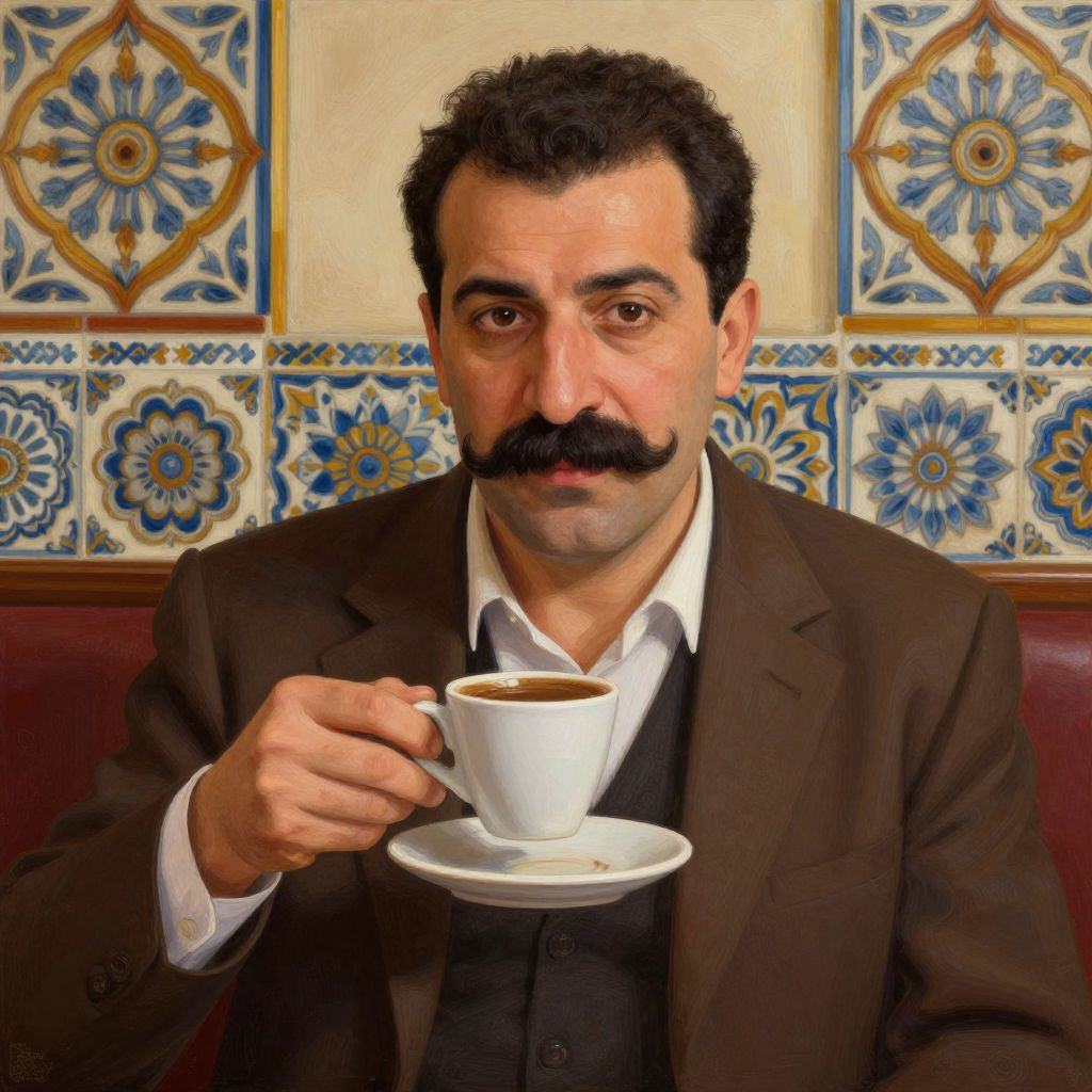 Portrait of a stereotypical Turkish man with thick mustache, holding a cup of Turkish coffee in a cozy cafe, ornate tiles and intricate patterns in background, warm tones, digital painting