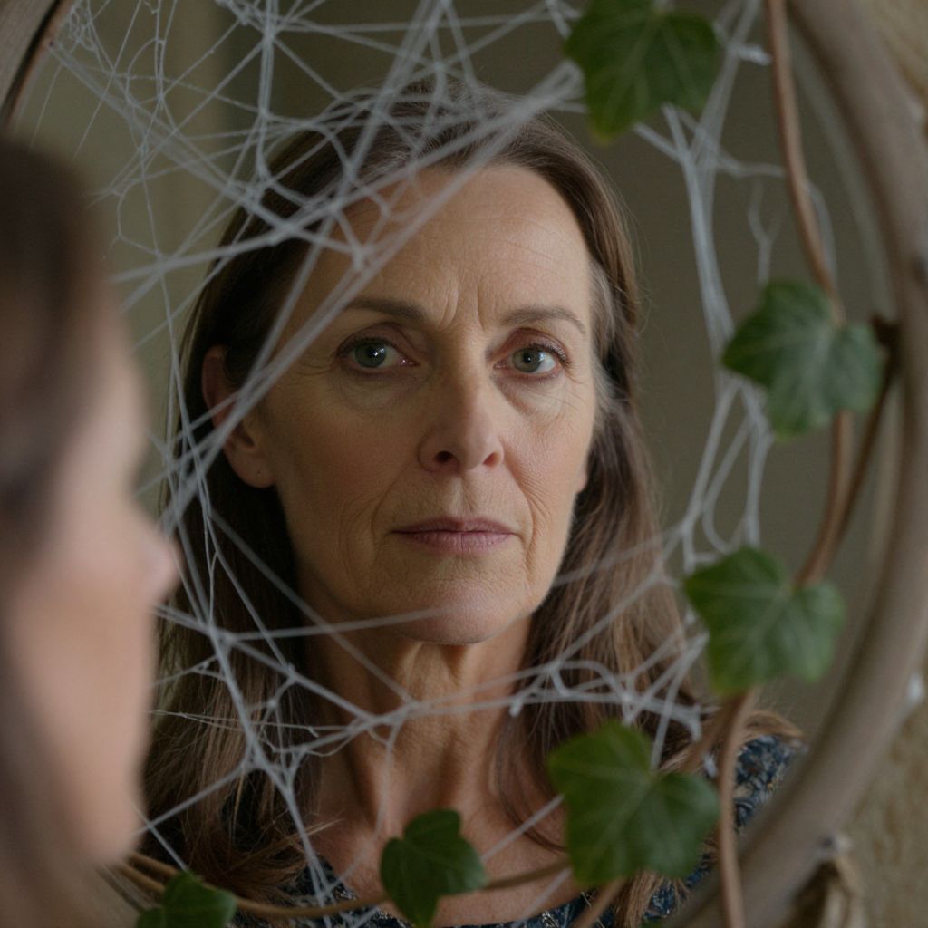 Create a photorealistic portrait of a middle-aged Celtic woman with deep creases around her eyes, reflecting her life's journey through the unique perspective of a mirror. The mirror is partially obscured by a tangled web of ivy, adding a layer of intrigue to the scene. With soft, diffused lighting, gentle shadows fall across the mirror's surface, accentuating the intricate details of her face. This composition captures a sense of serenity and introspection, revealing the essence of a Western European woman at peace with herself, while the intricate web of ivy hints at the complexities of her past.