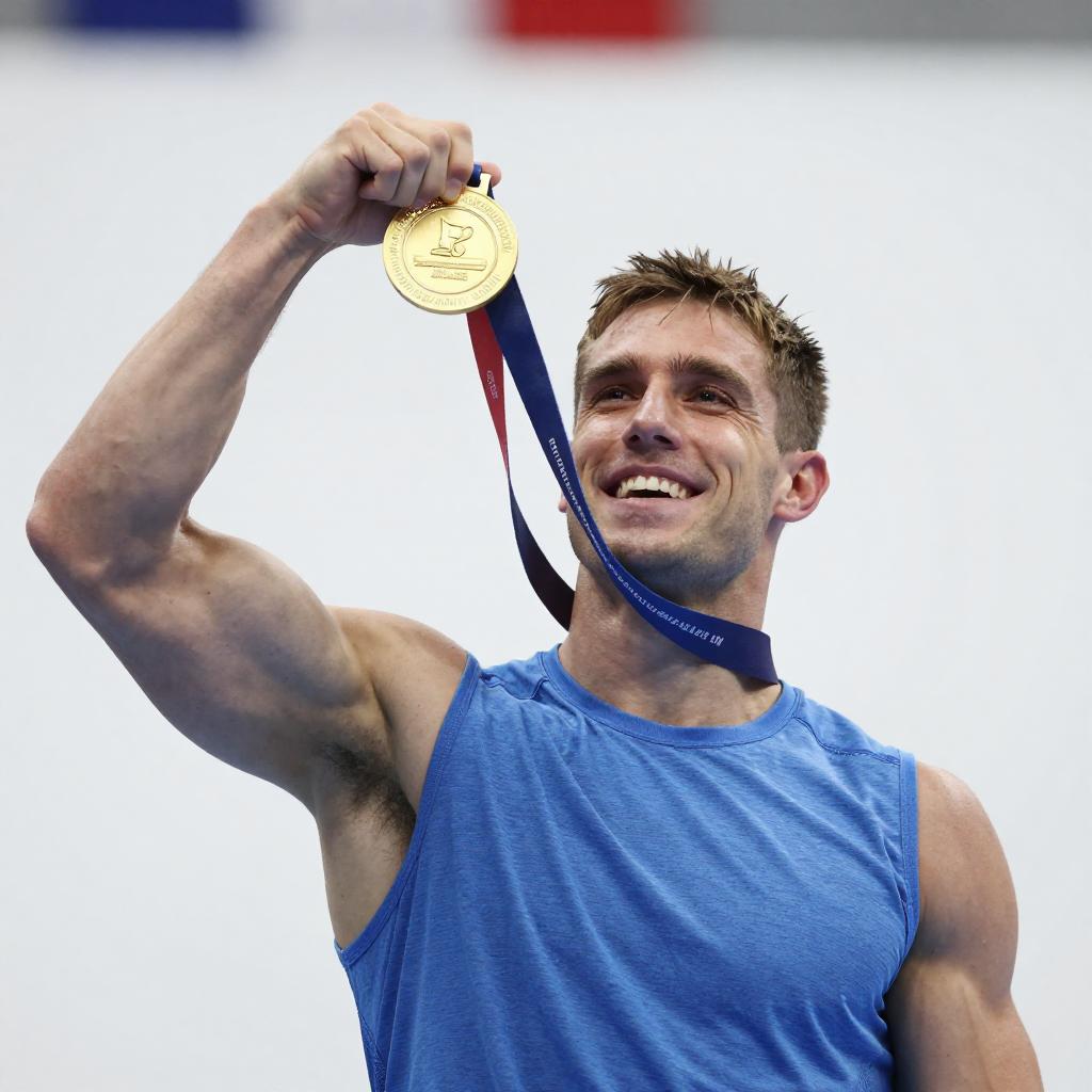 Photograph of a muscular, light-skinned man with short brown hair, wearing a sleeveless blue shirt, holding up a gold medal with his right arm raised. He's smiling with an open mouth, showing teeth. The background is completely white and blurred, emphasizing the subject. The lighting is bright and even, with no shadows. The camera angle is slightly low, capturing his upper body and face. The depth of field is shallow, keeping the man in sharp focus while the background is blurred.