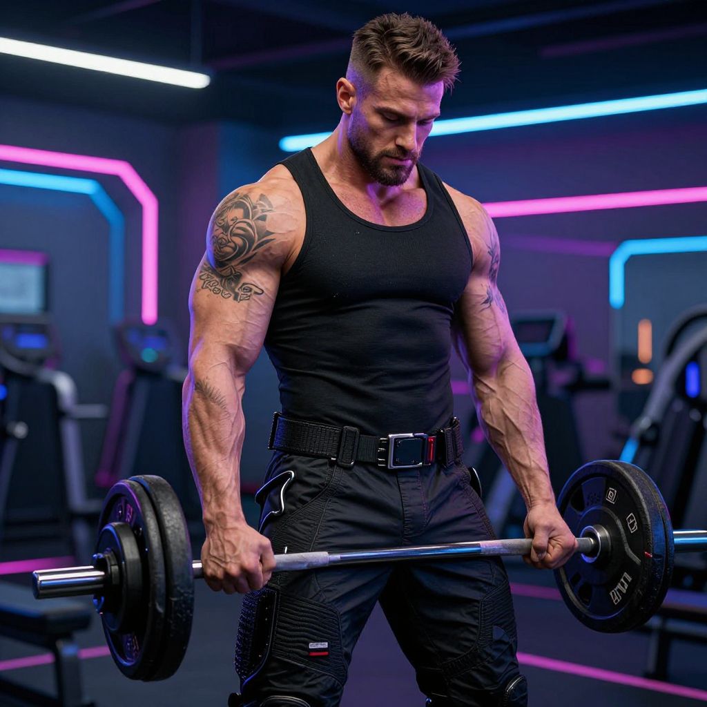A muscular, tattooed man in futuristic attire lifts weights in a neon-lit, cyberpunk gym.