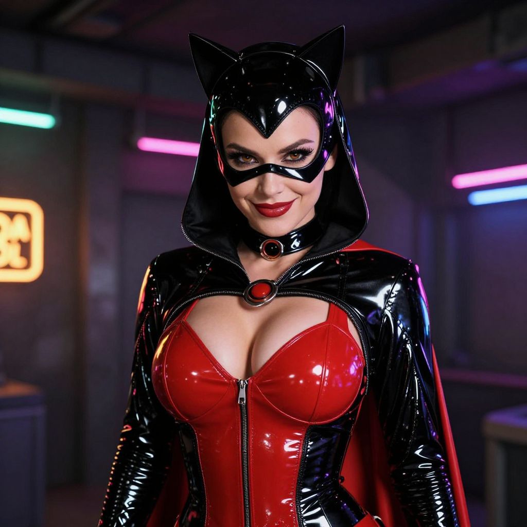 Photograph of a woman in a glossy, black and red latex catwoman costume. She has a black cat-eared hood, a black mask with pointed ears, red lipstick, and dark eye makeup. The costume features a red, low-cut, zippered top that highlights her cleavage and black, shiny, long-sleeved cape with a red gem at the collar. The background is dimly lit with neon lights in blue and pink, and a blurred, glowing yellow sign. The setting resembles a dark, futuristic room. The woman's confident expression and the shiny texture of the latex add a seductive and mysterious vibe.