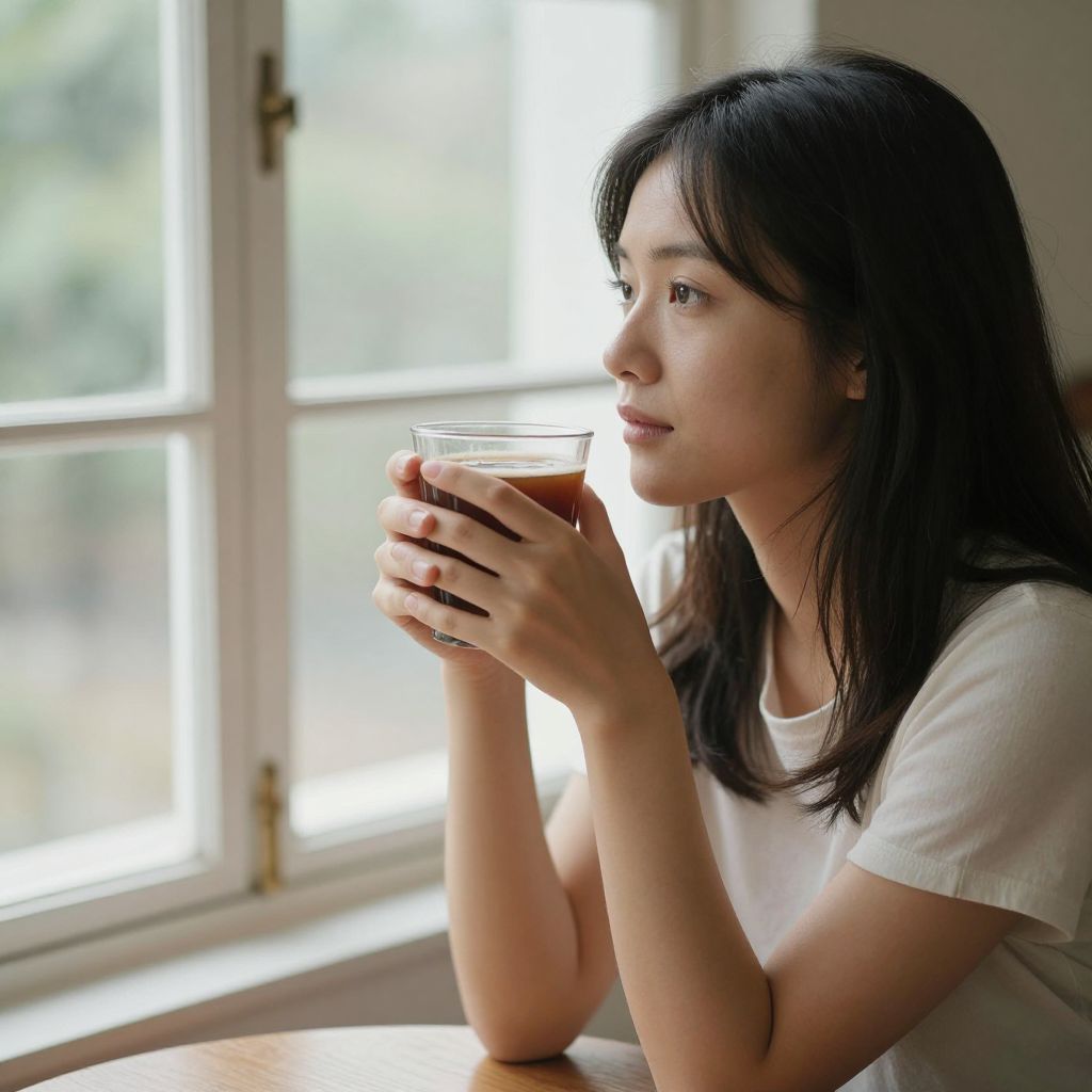Serene woman seated by a window, holding a glass cup filled with a dark beverage, her hands gently cradling it as she gazes thoughtfully to the side, illuminated by soft natural light streaming through the large pane behind her.