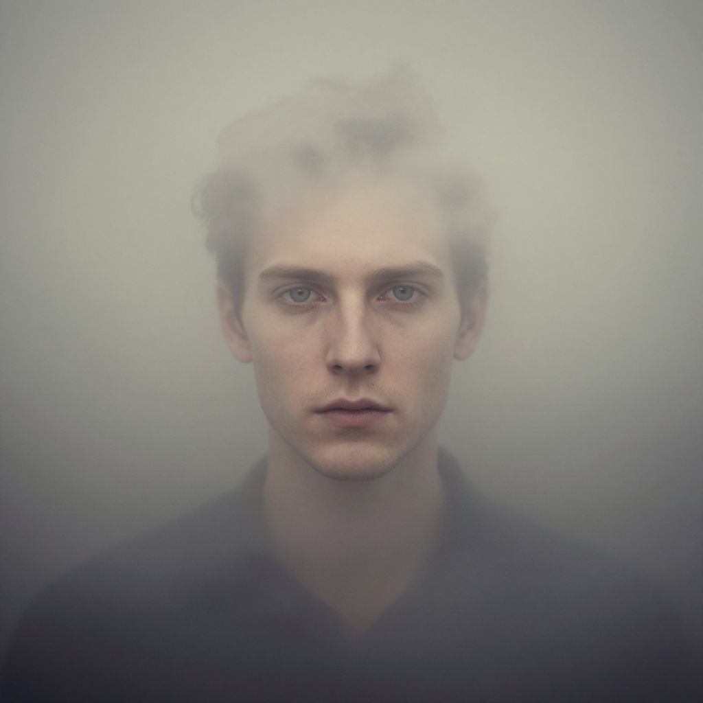 Photograph of a young Caucasian man with pale skin, light brown curly hair, and blue eyes. He has a serious expression and is wearing a dark, V-neck shirt. The background is a soft, foggy gray that blends into the subject's face, creating a dreamy, ethereal effect. The image is sharply focused on his face, with the background slightly blurred, emphasizing his features. The overall color palette is muted with shades of gray and blue, enhancing the misty, otherworldly atmosphere. The lighting is soft, with no harsh shadows.