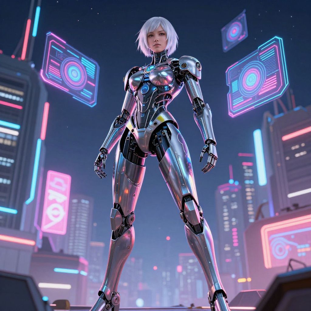 Photorealistic CGI image of a silver, female android with white, short hair standing confidently in a futuristic, neon-lit cityscape. Her metallic, shiny body is detailed with intricate joints and panels, displaying a sleek, robotic design. She has a slender, athletic physique with visible muscles. The background features towering buildings with vibrant neon signs in pink, blue, and purple, creating a cyberpunk atmosphere. Floating, glowing holographic squares with circular patterns surround her. The sky is dark, contrasting with the bright city lights, adding a sense of depth and modernity. The image exudes a sci-fi, high-tech vibe.